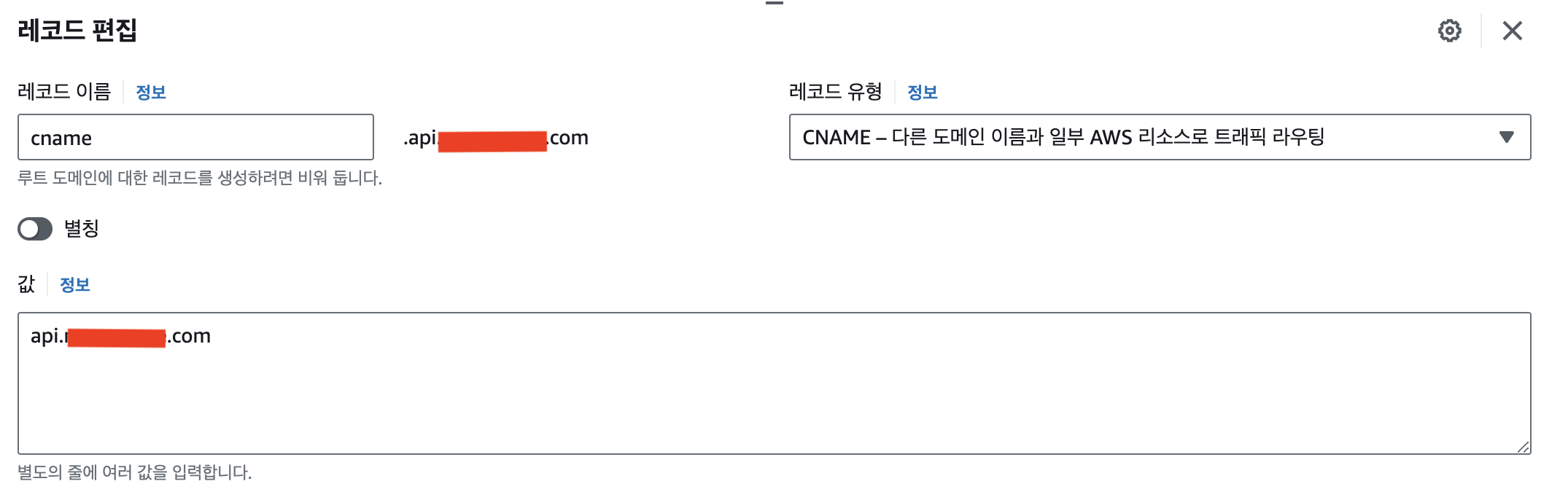 CNAME을 이용하여 다른 도메인으로 라우팅을 할 수 있습니다. 만약 cname.api.tistory.com 이라는 도메인에 접속하는 경우, api.tistory.com으로 자동으로 라우팅되도록 하고 싶다면 아래와 같이 접속하려는 도메인을 레코드 이름에 입력하고 트래픽 라우팅할 도메인을 값에 입력하면 손쉽게 라우팅을 할 수 있습니다.