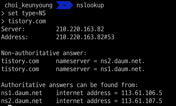 네임 서버에 장애가 발생했을 때 다른 NS 레코드 값을 통해서 이를 해결하기 위해서입니다. 그래서 최소 2개 이상을 사용하도록 권장하고 있습니다. 실제로 tistory.com의 NS 레코드를 살펴봤을 때 2개의 Name Server가 있는 것을 확인할 수 있습니다.