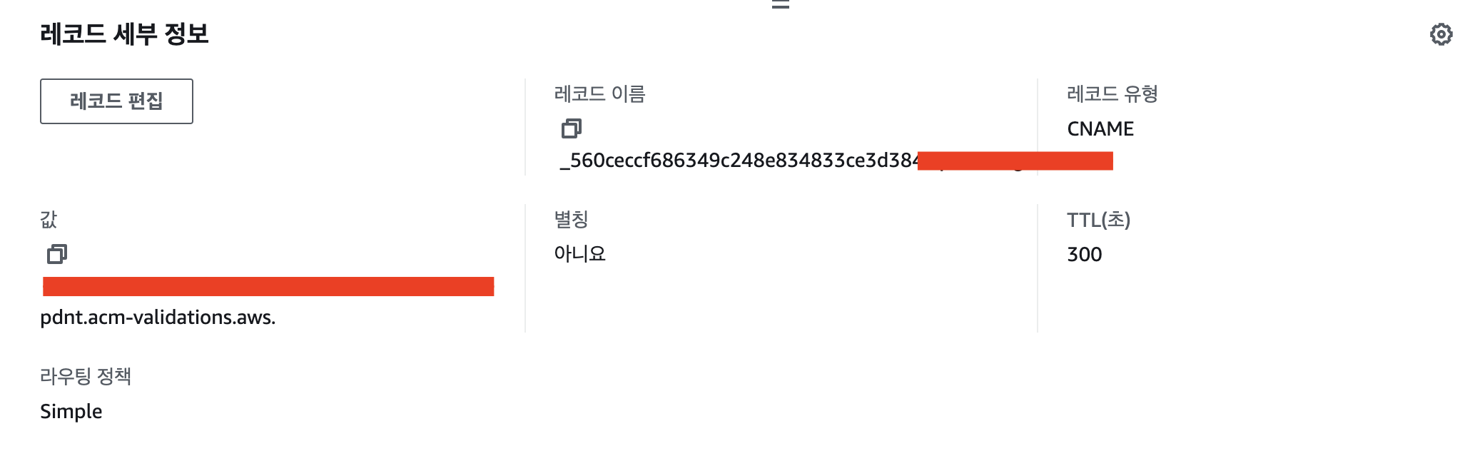 이때 ACM을 발급받는 과정에서 현재 도메인에 대한 인증을 받기 위해 CNAME 레코드를 사용해야 합니다.